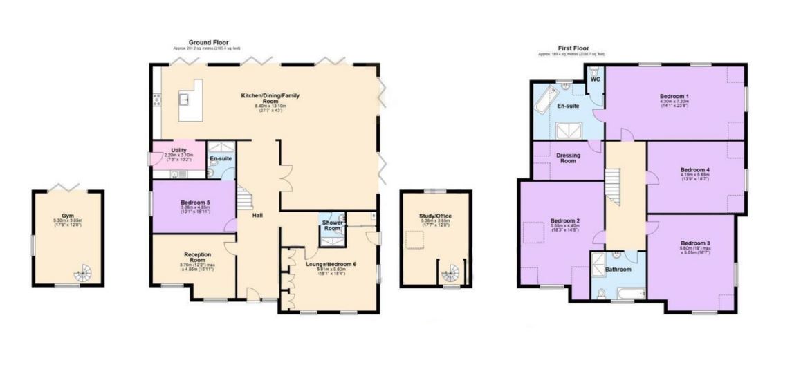 HALLPLAY ROOM/SITTING ROOM 5.79m (19'0") x 5.59m (18'4")RECEPTION ROOM/OFFICE 4.85m (15'11") x 3.71m (12'2")BREAKFAST KITCHEN/DINING & LIVING ROOM 13.11m (43'0") x 8.41m(27'7")UTILITY ROOM 3.10m (10'2") x 2.21m (7'3")BEDROOM FIVE 4.85m (15'11") x 3.07m (10'1")ENSUITE 2.21m (7'3") x 1.57m (5'2")SHOWER ROOM 1.50m (4'11") x 1.98m (6'6")FIRST FLOORPRINCIPAL BEDROOM 7.19m (23'7") x 4.29m (14'1")ENSUITE 3.51m (11'6") x 3.20m (10'6")DRESSING ROOM 4.14m (13'7") x 2.26m (7'5")BEDROOM TWO 5.56m (18'3") x 4.39m (14'5")BEDROOM THREE 5.79m (19'0") x 5.05m (16'7")BEDROOM FOUR 5.64m (18'6") x 4.19m (13'9")BATHROOM 3.25m (10'8") x 2.79m (9'2")OUTSIDE THE PROPERTYPRIVATE LANDSCAPED GARDENDETACHED GARAGE USED AS:GYM 5.31m (17'5") x 3.86m (12'8")STUDY/OFFICE 5.31m (17'5") x 3.86m (12'8")